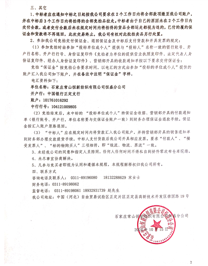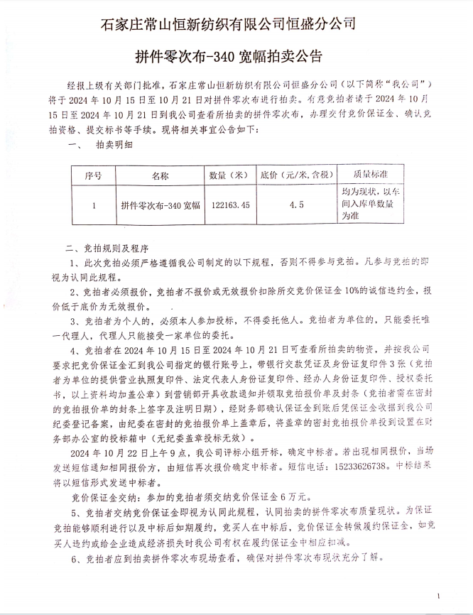 石家莊常山恒新紡織有限公司恒盛分公司 拼件零次布-340寬幅拍賣公告